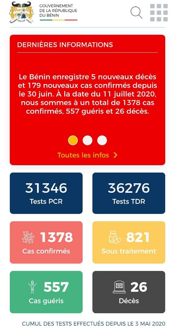A la date du 10 juillet 2020 , le tableau sanitaire lié à l’infection au Covid-19 au Bénin indique un total de 1378 cas confirmés, avec 821 personnes sous traitement, 557 guéris et 26 décès.