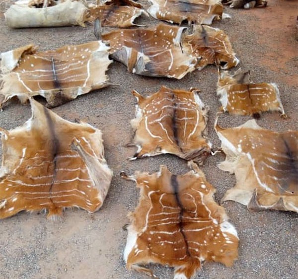 Des éléments de la Police Républicaine de Bohicon et de ceux de l’inspection forestière du Zou, avec la collaboration technique de AALF-Bénin ont réussi à mettre la main sur un individu qui avait en sa possession des peaux d’animaux sauvages. Ce présumé trafiquant détenait 15 peaux de guib harnaché qu’il a voulu commercialiser. Or, cette espèce est inscrite est annexe II de la loi 2002-16 du 18 octobre 2004 portant régime de la faune en République du Bénin. Etant une espèce protégée, nul n’a le droit de détenir ses trophées. L’article 153 de cette loi sanctionne d’une amende de 100.000 à 500.000F et/ou d’un emprisonnement de 3 mois à 3 ans quiconque détient des animaux sauvages sans permis requis et fait circuler des trophées ou des dépouilles sans certificat d’origine. L’article 154 de la même loi punit de 300.000 à 800.000F et/ou d’un emprisonnement de 6 mois à 5 ans quiconque importe, exporte, réexporte ou commercialise des animaux sauvages ou leurs trophées et dépouilles en dehors des cas permis. Au regard de ces dispositions juridiques, aucune tolérance ne devrait être accordée aux trafiquants des trophées d’espèces intégralement et partiellement protégées.