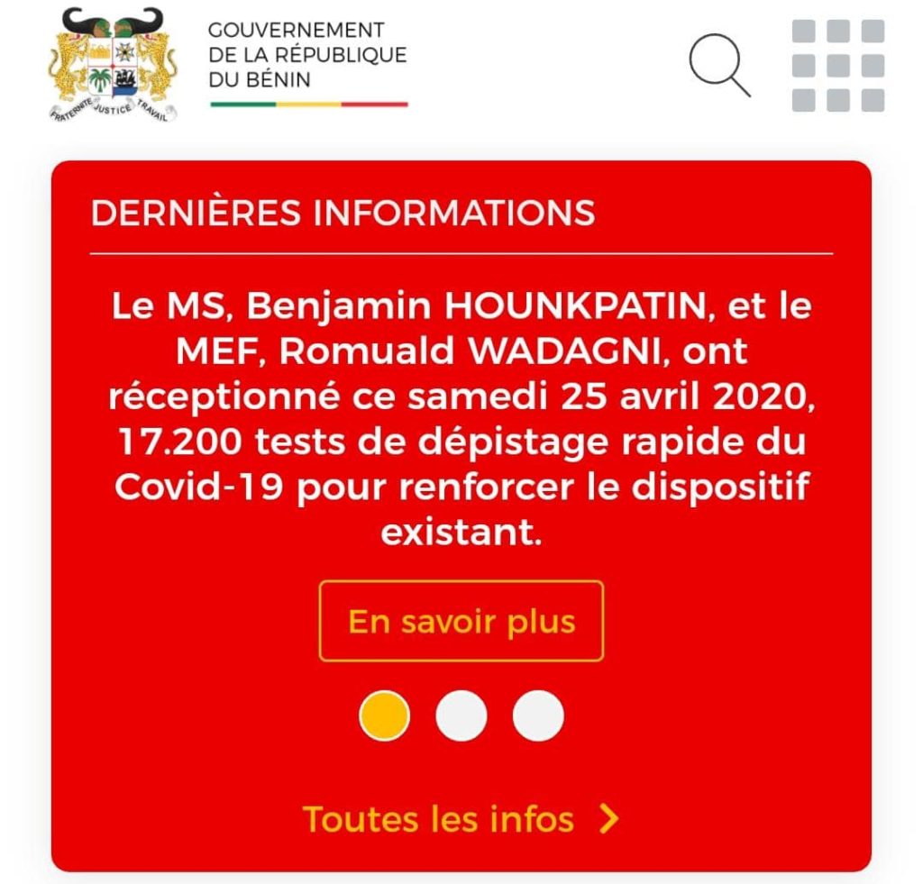 Le ministre de la Santé, Benjamin HOUNKPATIN, et le ministre de l’Economie et des Finances, Romuald WADAGNI ont réceptionné ce samedi 25 avril 2020 à l’aéroport de Cotonou, 17.200 tests de dépistage rapide du Covid-19 pour renforcer le dispositif existant.