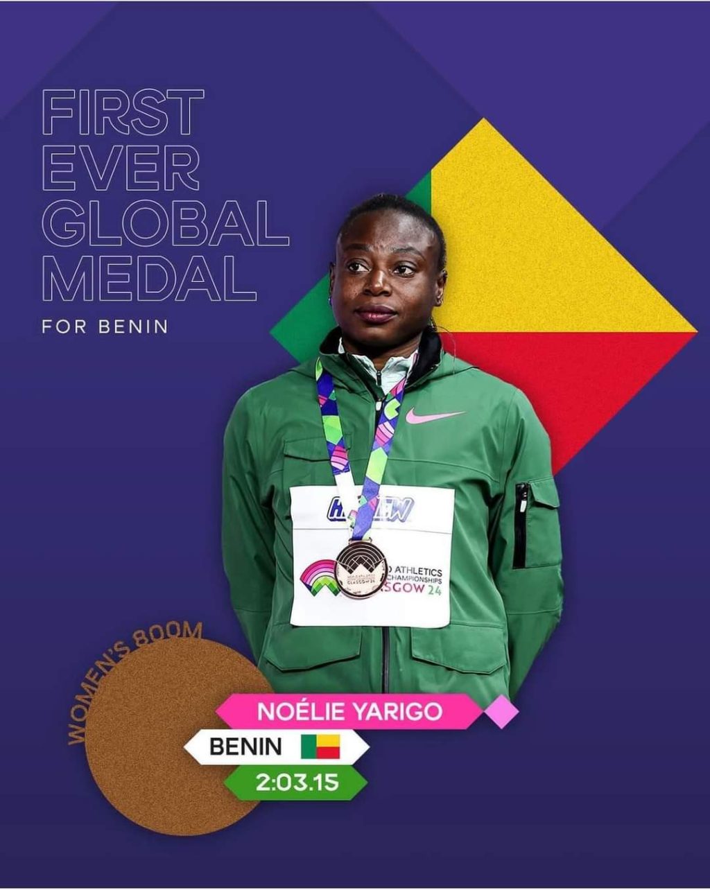 Intrépide amazone, Yarigo Noélie, la gazelle de Matéri a écrit les plus belles pages de l’athlétisme béninois le 3 mars 2024 en Glasgow en Écosse, au Royaume-Uni, l’une de ses plus belles histoires en athlétisme et par ricochet la plus merveilleuse de l’athlétisme béninois en décrochant pour son pays le Bénin, la première médaille (bronze) mondiale sur les 800 mètres. Quelle fierté pour tout un peuple !