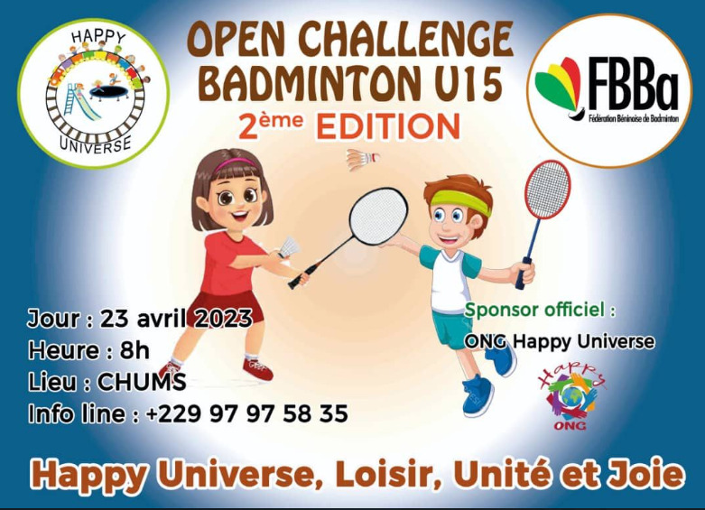 Promouvoir et développer le badminton au Bénin, tel est l’objectif de la Fédération béninoise de badminton (Fbba) dirigé par Aubin Assogba en collaboration avec le Club Happy Universe Multisports (CHUMS) en organisant pour le compte de la saison sportive 2023, la deuxième édition de l’open challenge U-15 le dimanche 23 avril prochain. Réservé uniquement à la catégorie minime (Garçons et filles de moins de 15ans) provenant des associations, des clubs, des écoles shuttle time, des centres et autres, cette compétition permettra de mettre en jambe les athlètes pour les compétitions qu’organisera la Fédération lors de cette saison. Au menu de cette compétition, un camp de formation, match de poules, quart de final , demi-finale et finale avec plusieurs récompenses à la fin des différentes épreuves. Signalons que cette compétition qui lance la saison sportive au sein de la Fbba va se dérouler le dimanche 23 avril au CHUMS sis à côté de la Direction de la Relation Publique de l’Ortb et que pour prendre part à cette activité que les athlètes doivent donner une participation qui s’élève à 2000fcfa/enfant.