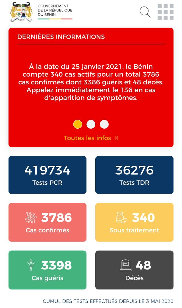 À la date du 25 janvier 2021, le Bénin compte *340 cas actifs* pour un total 3786 cas confirmés dont 3386 guéris et *48 décès*.