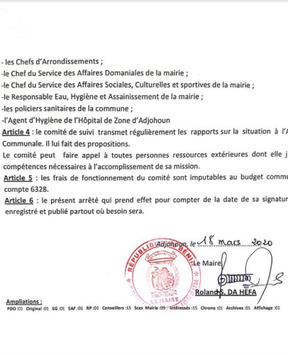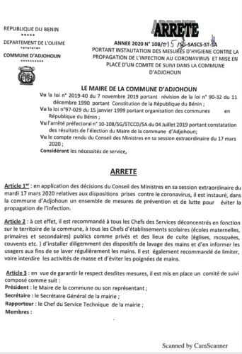 Conformément aux décisions du conseil extraordinaire du mardi 17 mars 2020 pour prévenir et lutter contre la propension du Coronavirus au Bénin, le maire de la commune d’Adjohoun, Roland DA HEFA a décidé de l’instauration des mesures d’hygiène contre la propagation de l’infection au Coronavirus et la mise en place d’un comité de suivi dans la commune d’Adjohoun.