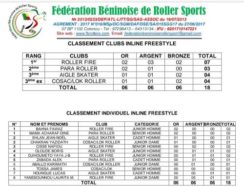 La neuvième édition du championnat national de roller sports qui a eu lieu en speed skating, et en Inline freestyle a connu son épilogue le 26 novembre 2023 à Cotonou (Akpakpa) situé derrière le ciné concorde. A l’issue des deux jours de compétitions, Roller Fire de Porto-Novo et Roller Pro de Cotonou s’adjugent les premières places en décrochant plus de médailles.
