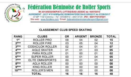 Para-roller de Parakou, roller fire de Porto-Novo, smart rider de Cotonou, Lok roller de Lokossa, roller s men de Godomey, élites omnisports de Calavi ; super roller de Cotonou, héros roller de Godomey, Agla roller d’Agla, king roller d’Abomey, Aigle skater d’Akpakpa et roller pro de Cotonou sont les clubs qui ont pris part à l’édition 2023 du championnat national de roller sport organisé par la Fédération béninoise de roller sport (FbRs) conformément à son plan de travail annuel. Ainsi, pendant deux jours de compétitions, les athlètes venus de ces clubs ont démontré devant les amoureux et quelque férus de la discipline leur technique dans les catégories hommes et dames dans les disciplines (speed skating, Inline freestyle) dans les épreuves 100 m sprint, 1lap sprint, 10 km point et 15 km. A l’issue de la compétition, roller pro de Cotonou et roller fire de Porto-Novo terminent à la première place en décrochant respectivement quinze médailles dont neuf en or, quatre en argent et deux en bronze et douze médailles dont trois en or, cinq en argent et quatre en bronze. Heureux d’avoir suivi cette compétition, Franklin Ahounou vice-président de la Fédération béninoise de roller sport à saluer les différents clubs qui ont répondu à l’appel du comité exécutif de la Fédération béninoise de roller sport en prenant part à l’édition 2023 de ces championnats nationaux. « Nous avons tenu le pari de l’organisation et les résultats obtenus forcent l’admiration, et je suis satisfait du travail qui se fait par les clubs pour le développement de cette discipline » a-t-il signifié. Il a aussi profité pour féliciter la direction technique nationale qui abat un travail énorme avant de leur demander de faire des propositions afin que les deux épreuves se déroulent séparément lors des compétitions. Abondant dans le même sens que son vice-président, le directeur technique national de la FbRs Frank Enock Hossou, a salué la constance et la ténacité des athlètes dans les catégories hommes et dames qui sont dans l’élite. « Les athlètes ont produit de belles prestations en témoigne les différentes médailles obtenus par ces derniers lors de ce championnat. Nous avons vu de belles prestations et détecter des athlètes qui seront suivi par la direction technique nationale qui va les suivre pour le développement du roller sport béninois » a –t-il déclaré.