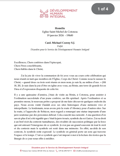 Lire l’intégralité de l’homélie Cardinal Michaël CZERNY à la messe pontificale du 19 janvier 2024 à l’église St Michel de Cotonou.