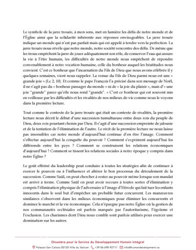 « Le symbole de la jarre trouée, à mon sens, met en lumière les défis de notre monde et de l’Église ainsi que la solidarité inhérente aux réponses envisageables. La jarre trouée indique un monde qui n’est pas parfait mais qui est appelé à tendre vers la perfection. La jarre trouée nous révèle que notre monde, notre société rencontre des défis. De même que les trous empêchent la jarre de jouer adéquatement son rôle, de conserver l’eau qui assure