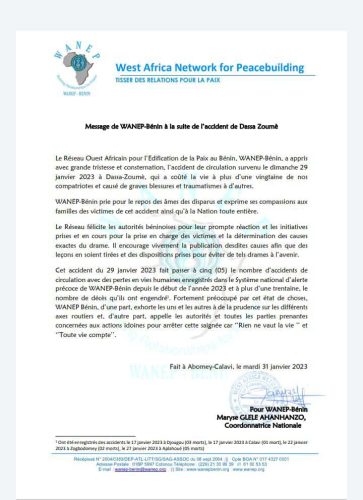 Le dimanche 29 Janvier dernier à la hauteur de Dassa-Zoumé,un grave accident de circulation a endeuillé le peuple béninois. En effet,venant de Parakou, un bus d’une compagnie de la place a pris feu dans la zone de SOS Dassa après avoir été persécuté par un camion citerne. Touché par cette terrible nouvelle qui a frappé plusieurs familles, Wanep-Bénin à travers un communiqué signé de la coordonnatrice nationale adresse ses compassion aux familles des victimes ainsi qu’à la Nation.