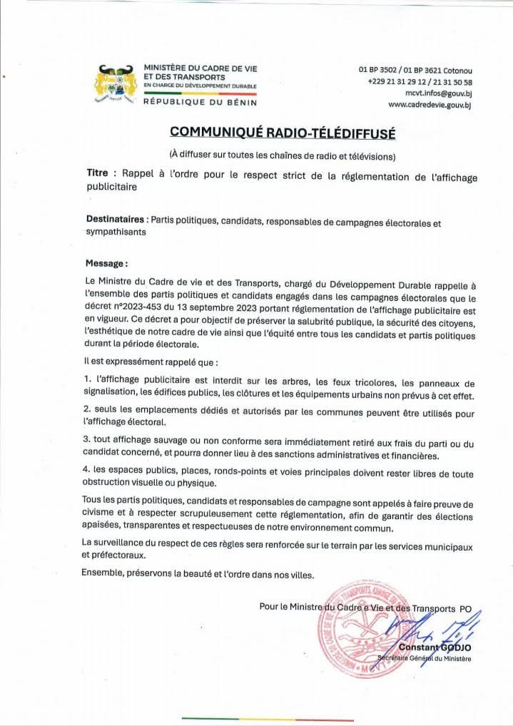 Tout affichage « sauvage » ou non conforme sera immédiatement retiré aux frais du candidat ou du parti responsable. Des sanctions administratives et financières lourdes seront appliquées.