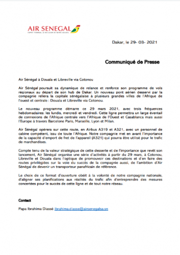 L’information a été livrée aux médias ce lundi 29 mars au cours d’une conférence de presse présidée par le directeur de la compagnie. Le vol inaugural a eu lieu ce lundi 29 mars 2021.C’est maintenant une réalité. Les vols en direction du Bénin avec la compagnie Air Sénégal sont possibles. Aboubakar Kane a fait part de leur vision à travers les nouvelles destinations dont le Bénin. « Nous sommes là pour relancer la ligne de Cotonou. La relation entre le Bénin et le Sénégal est très vielle. Ce sont des liens culturels qui datent d des années. Nous sommes là pour consolider ces liens », a laissé entendre le directeur.