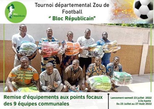 Le tournoi du Bloc Républicain du Zou, c’est 9 équipes pour 7 trophées et plusieurs d’autres lots. En effet, ledit tournoi est subdivisé en deux groupes suivant le découpage électoral. Le groupe A dudit tournoi est composé des communes de la 23è Circonscription dont Abomey, Agbangnizoun, Bohicon et Djidja. Le groupe B est constituée des villes de la 24è circonscription électorale composée de Covè, Ouinhi, ZaKpota, Zagnanado et Zogbodomey. À l’issu des rencontres de poules les deux premiers de chaque groupe seront qualifiés pour la grande finale et les deuxièmes joueront la petite finale. Selon l’organisateur principal de cet événement Amos LANGANFIN, plusieurs gratifications attendent les équipes avec un prix spécial réservé à l’équipe Fair-play, car pour lui au Bloc Républicain, la Fraternité est le mot d’ordre. Pour annoncer les couleurs, le Républicain Amos LANGANFIN a dans la journée du Jeudi 21 Juillet 2022 doté toutes les 9 formations participantes à la compétition des équipements de jeux. Place alors au jeu pour la découverte de la commune cavalière qui montera sur le cheval du Bloc Républicain dans le Zou.