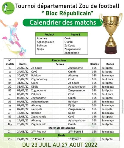 Prévu pour démarrer le samedi 23 Juillet 2022, le championnat qui a reçu les bénédictions du premier responsable du parti du Bloc Républicain, le Secrétaire Général National , Abdoulaye Bio Tchané et du Secrétaire à l’information et à la Communication, Porte Parole du parti du cheval cabré, Janvier Yahouédéhou se jouera sur deux stades du 23 Juillet au 27 Août 2022. Les stades de ZaKpota et Paulin Tomadaga de Bohicon sont les antres retenus pour recevoir les rencontres de cette compétition départementale.