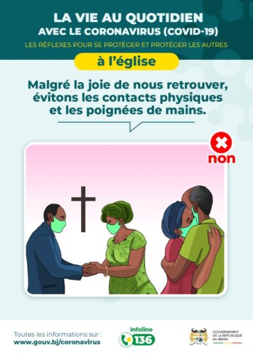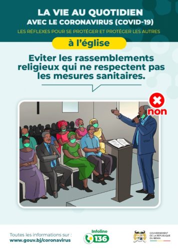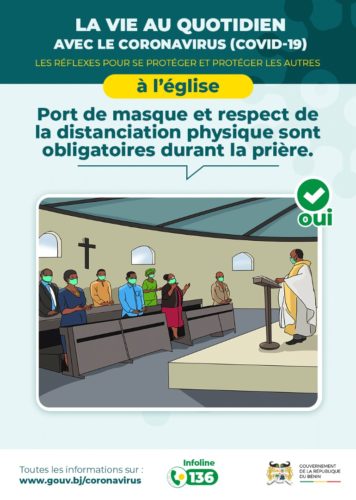 Dans le cadre de allègement des mesures de riposte contre le Coronavirus (Covid-19) au Bénin, le Gouvernement du Bénin a décidé après concertation avec les responsables religieux d’autoriser la réouverture à compter du mardi 2 juin 2020, des lieux de culte (églises, mosquées, temples, etc.) sur toute l’étendue du territoire national et ceci dans le strict respect des consignes officielles.