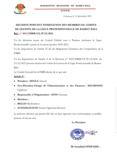 Le Comité exécutif de la fédération béninoise de basketball conduit par Ismahinl Onifadé a procédé le lundi 13décembre dernier à la nomination des membres du comité de gestion de la ligue professionnelle de basketball (CGLPB). Ce comité composé de cinq membres est dirigé par Arnaud Dègla qui a été désigné président.