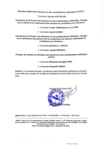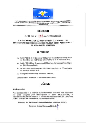 28 février 2022 Moele-Bénin/Directiondes élections et des manifestations offielles: Arsène Soglo et 7 collaborateurs nommés Post navigation Précédent Eusebe Dossou décroche le Zénith pour 2023Suivant Super Ligue Pro : Coton FC, Buffles, les 04 favoris au sacre finale Voir aussi Actualités La Une Médias et inclusion financière au Bénin Le RJCIF créé, Adam HOUETENON élu Président 12 décembre 2025 Actualités Sports CAN MAROC 2025 : les 28 Guépards retenus par Rohr ! 12 décembre 2025 Actualités La Une Politique LES MINISTRES DES AFFAIRES ÉTRANGÈRES DU NIGÉRIA ET DU BÉNIN TIENNENT UNE CONFÉRENCE DE PRESSE CONJOINTE SUR LE RÉTABLISSEMENT DE LA GOUVERNANCE DÉMOCRATIQUE AU BÉNIN ET LA SÉCURITÉ RÉGIONALE 12 décembre 2025