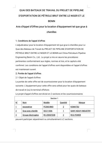 Avis d’Appel d’Offres pour la location d’équipement tel que grue à chenilles