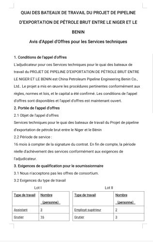 QUAI DES BATEAUX DE TRAVAIL DU PROJET DE PIPELINE D’EXPORTATION DE PÉTROLE BRUT ENTRE LE NIGER ET LE BENIN: Avis d’Appel d’Offres pour les Services techniques