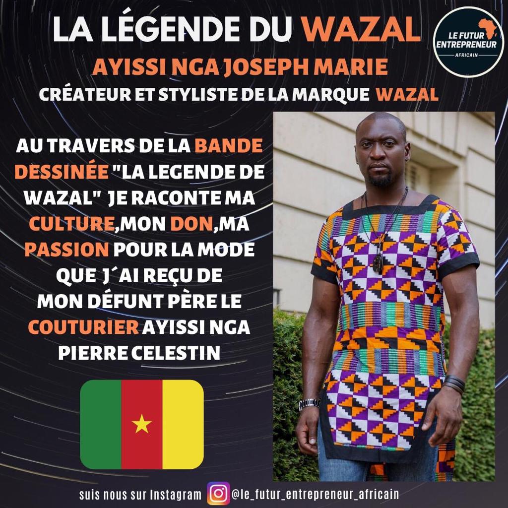 Ces concepts s’appuient sur des crite?res qui ont depuis le de?but symbolise?s son parcours : Audace, Respect et Cre?ation. Les coupes Wazal sont futuristes et modernes, suivants les dernie?res tendances d’aujourd’hui. Ayissi Nga joseph Marie a? e?te? nomme? au beffta awards 2016 a? Londres. La le?gende de Wazal » est un conte qui a pour cadre l’Afrique et ce n’est pas qu’une histoire pour se divertir. Imager ce conte a? travers la bande dessine?e a aussi pour but de pre?senter cette partie de l’Afrique qui est la re?gion du bassin du Lac Tchad et les pays qui composent cette re?gion, dont le Cameroun. Les paysages – l’architecture – les coutumes – les interdits – les rituels – les cultures vestimentaires – les e?toffes – les accessoires – les coiffures – les couleurs de la vie quotidien… »