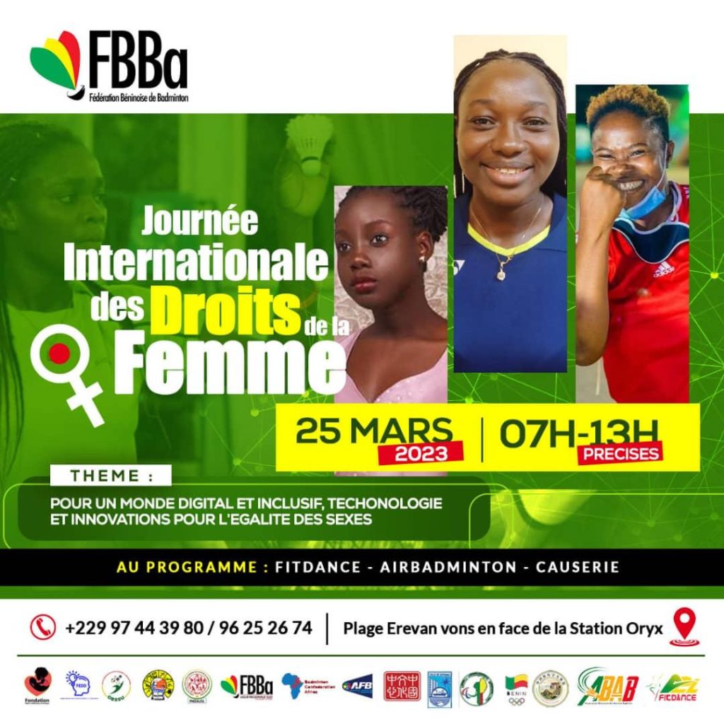 La Fédération béninoise de badminton (FBBA) dirigé par Aubin Assogba à travers la commission des femmes présidées par Hermione Ligan et les organismes partenaires organisent le 25 mars 2023 l’édition 2023 de la journée internationale des droits de la femme, une activité inédite dédiée à la promotion de la gente féminine. Au menu, plusieurs activités sont prévues dont : le Fit dance, l’air badminton, et une causerie sur le thème : Pour un monde digital et inclusif, technologie et innovations pour l’égalité des sexes. Rappelons que l’activité aura lieu le 25 mars prochain au niveau de la plage Erevan, Von en face de la station oryx.