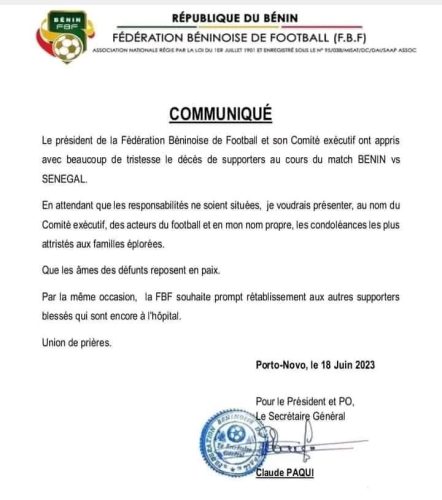 19 juin 2023 Post navigation Précédent Match Bénin- Sénégal : la FBF au chevet des supporteurs blessésSuivant Bénin/Football/Saison 2022-2023 : Mathurin de Chacus honore les meilleurs Voir aussi Actualités La Une Médias et inclusion financière au Bénin Le RJCIF créé, Adam HOUETENON élu Président 12 décembre 2025 Actualités Sports CAN MAROC 2025 : les 28 Guépards retenus par Rohr ! 12 décembre 2025 Actualités La Une Politique LES MINISTRES DES AFFAIRES ÉTRANGÈRES DU NIGÉRIA ET DU BÉNIN TIENNENT UNE CONFÉRENCE DE PRESSE CONJOINTE SUR LE RÉTABLISSEMENT DE LA GOUVERNANCE DÉMOCRATIQUE AU BÉNIN ET LA SÉCURITÉ RÉGIONALE 12 décembre 2025
