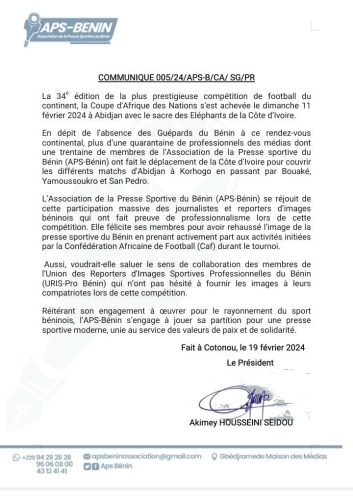 L’ Association de la presse sportive du Bénin ( APS -Bénin) dirigée par Akimey Housséini a adressé une lettre de félicitations aux journalistes, reporters sportifs qui ont pris part à la 34ème édition de la coupe d’Afrique des Nations Côte d’Ivoire 2023 malgré l’absence de l’équipe nationale du Bénin. C’est à travers un communiqué paru à la rédaction du quotidien Notre Époque que cette association exprime toutes sa reconnaissance et sa fierté à l’endroit de ces hommes des médias pour leur contribution au football africain.