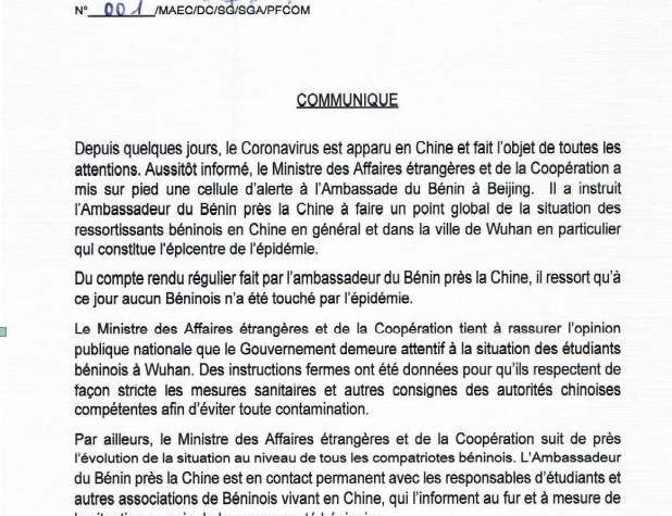 Santé Santé et diplomatie/Coronavirus : Communiqué du Ministère des Affaires étrangères aux Béninois de Chine à propos du coronavirus 7 février 2020