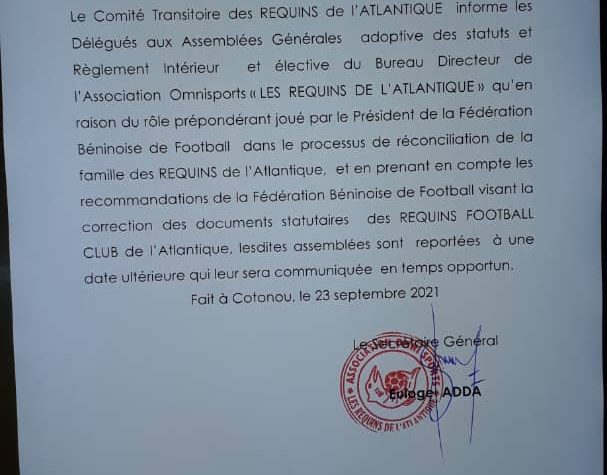Actualités Sports Assemblée générale des Requins de l' Atlantique : Les Requins de l’Atlantique ( Requins fc) reportent leurs assemblées générales 26 septembre 2021