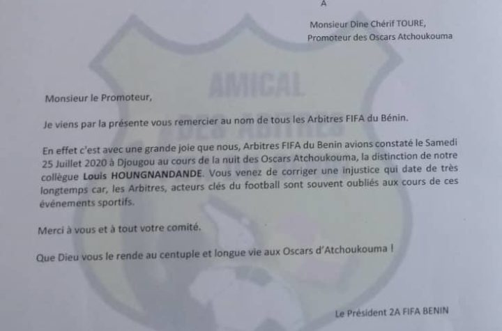 Actualités Sports Deuxième édition de la Nuit des Oscars Atchoukouma 2020 : L’amicale des arbitres FIFA du Bénin remercie Chérif Dine Touré 12 août 2020