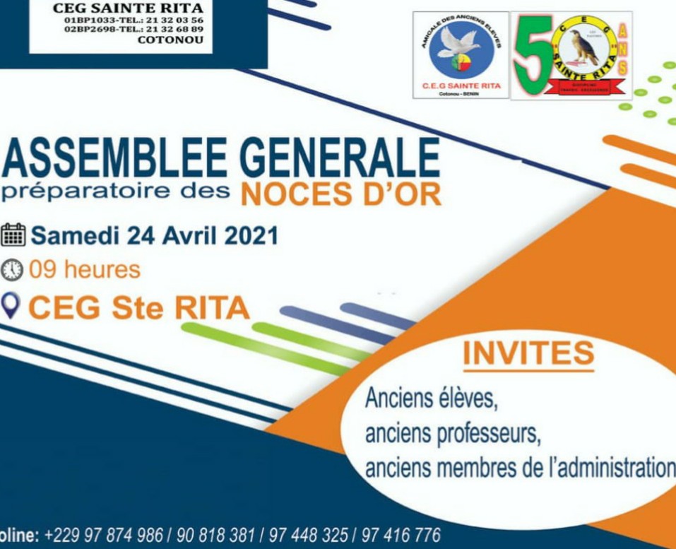 Tous les anciens élèves, les anciens professeurs, les anciens membres de l’administration, les parents et les sympathisants du CEG Sainte Rita sont invités à une AG préparatoire des noces d’or dudit collège.