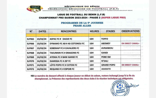 24 mars 2024 Les affiches du week-end Post navigation Précédent ATHLETISME/19EME EDITION DES CHAMPIONATS DU MONDE DE GLASCOW «Une Championne se prépare sur la durée et Je suis fière d’avoir cette médaille» dixit l’Amazone Noëlie YarigoSuivant Élection des professionnels des médias à la HAAC :Armand HOUNSOU enregistre sa candidature Voir aussi Actualités La Une Médias et inclusion financière au Bénin Le RJCIF créé, Adam HOUETENON élu Président 12 décembre 2025 Actualités Sports CAN MAROC 2025 : les 28 Guépards retenus par Rohr ! 12 décembre 2025 Actualités La Une Politique LES MINISTRES DES AFFAIRES ÉTRANGÈRES DU NIGÉRIA ET DU BÉNIN TIENNENT UNE CONFÉRENCE DE PRESSE CONJOINTE SUR LE RÉTABLISSEMENT DE LA GOUVERNANCE DÉMOCRATIQUE AU BÉNIN ET LA SÉCURITÉ RÉGIONALE 12 décembre 2025