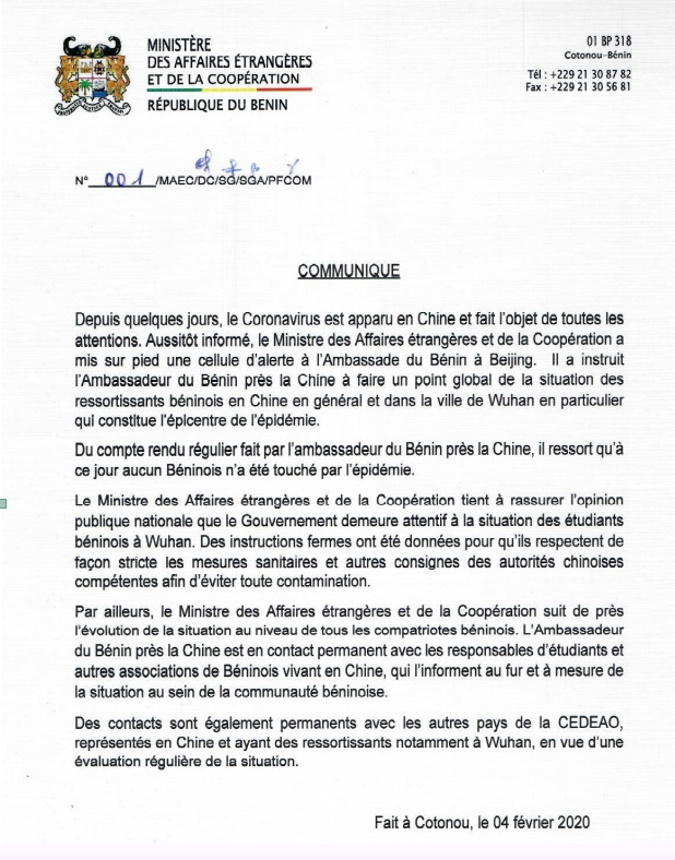 7 février 2020 +PDF Communiqué Cononavirus Post navigation Précédent le ministre Wadagni décroche 175 millions d’Euros pour la réalisation du projetSuivant Le Bénin présent à Tunis pour renforcer ses capacités en Parkour Laisser un commentaire Annuler la réponseVous devez vous connecter pour publier un commentaire. Voir aussi Actualités Santé LDCB : important communiqué de presse sur les céréales de Cerelac vendus en Afrique 18 novembre 2025 Actualités Santé Santé mentale au Bénin : Djomion AHIMAKIN annonce la 3ème édition du Festival International du bien-être mental 4 septembre 2025 Actualités Economie Education Emploi La Une Santé Société Technologie Tendances Actuelles L’engagement volontaire à Sinendé : L’ AnpE consolide le discours qui conduit à insertion professionnelle 25 mars 2025