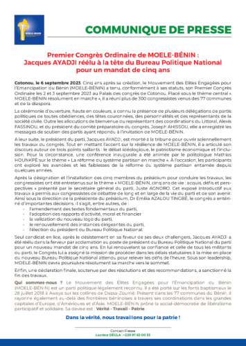 Outre la réélection du président Jacques Ayadji à la présidence du bureau politique du parti, le congrès a statué sur certains points pour donner plus d’entrain au parti dans la sphère des formations politiques. Entre autres décisions entérinées au cours du premier congrès ordinaire du parti MOELE-BENIN tenu les 2 et 3 septembre 2023 sont: l’amendement des textes fondamentaux du parti, l’adoption des rapports d’activités, morales financier, la validation du nouveau logo du parti, le renouvellement des instances dirigeantes du parti. Il a noté que en renouvelant sa confiance au président Jacques Ayadji, le congrès lui a assigné la mission de procéder dans les délais statutaires, la mise en place du nouveau bureau politique nationale. Ledit bureau qui est appelé à relever les défis de l’heure.