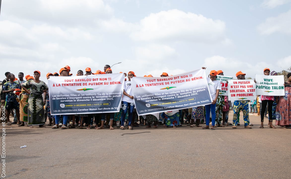 Six jours après le coup d’État déjouée par les forces de défense et de sécurité, Savalou a envoyé un message clair et retentissant : NON à la déstabilisation, OUI à l’ordre constitutionnel. Une forte mobilisation citoyenne a en effet convergé ce samedi 13 décembre 2025 dans la ville pour affirmer son soutien aux institutions de la République et à la paix. L’appel à la vigilance et à la cohésion nationale a été lancé par une véritable « union sacrée » des forces vives de Savalou. Autour de Conrad Gbaguidi, président du Conseil Economique et Social et enfant du terroir, se sont rassemblés les jeunes du creuset Debout Savalou, les responsables de l’Association pour le Développement de la Commune de Savalou (ADCS), des femmes, artisans, scolaires, sages et une représentation notable du Palais Royal. Des figures politiques des partis UPR, BR et Moelle Bénin ont également massivement répondu à l’appel.