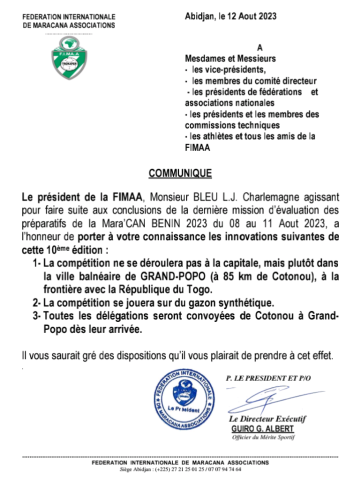 Du 8 au 11 août dernier, une mission de la Fédération Internationale de Maracana Associations (FIMAA) conduite par le Docteur Herbert KAMGANG DOUMBISSI président de la commission des compétitions de la FIMAA a effectué une mission d’inspection au Bénin en vue de voir le niveau d’avancement des travaux entrant dans le cadre de l’organisation de la dixième édition de la coupe d’Afrique des Nations Mara’can Grand-POPO 2023. Ainsi, suite au rapport reçu, le président de l’instance internationale de maracana Bleu Charlemagne a adressé une lettre de félicitation au comité d’organisation et à son superviseur général pour les innovations mises dans le cadre de cette compétition. Il a profité pour demander à ces derniers de prendre les dispositions nécessaires afin que l’esprit (CFA) Convivialité Fraternité Amitié soit au rendez-vous lors de cette belle fête continentale du maracana.