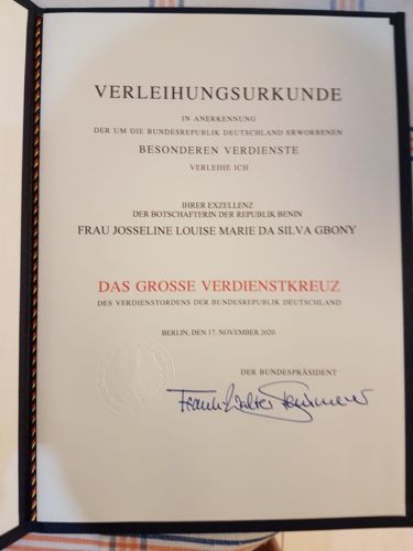 Signalons que, chaque année, des personnalités de grandes qualité sont choisies sur ordre du Président de la RFA pour recevoir la Großes Verdienstkreuz et que Da Silva Gbony Josseline a reçu son prix il y a quelques jours.