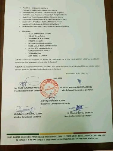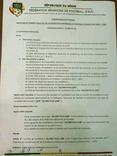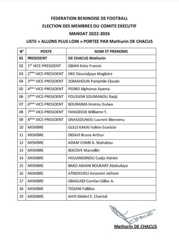 Ouvert par la commission électorale de la fédération béninoise de football présidée par Me Eli Vlavonou Kponou, le 6 Juillet 2022, l’appel à la candidature pour l’élection des membres du comité exécutif de la FBF n’a trouvé qu’un seul client. La liste « Allons Plus loin » conduite par le président sortant Mathurin De Chacus est la seule à se présenter devant la commission pendant les quinze jours prévus pour recevoir les dossiers de candidature. Déposé par le mandataire, Bouraïma Imorou, le dernier jour des dépôts de candidature, la liste « Allons Plus loin » n’est rien d’autre que la liste « Nouveau Départ » qui a été plébiscité en 2018 à la tête de la faîtière du football béninois à quelques exceptions près. En effet, sur les 19 membres que comportaient la liste « Nouveau Départ », 17 répondent présents dans la nouvelle liste constituée ayant pour dénomination » Allons Plus loin ». Deux nouvelles entrées dues à l’inactivité des précédents. Firmin Aplogan remplacé par Bruno Didavl a été rappelé par Dieu au cours du mandat en fin d’exercice et Guy Marie d’Almeida suppléé par Gilles Gbaguidi est sujet de poursuites judiciaires.