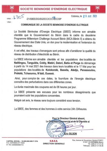 DÉMARRAGE À COMPTER DU 14 MAI 2021 DES TRAVAUX DE RENFORCEMENT ET DE REHABILITATION DU RESEAU DE DISTRIBUTION DE L’ELECTRICITE AU NIVEAU DES LOCALITES DE NATITINGOU, TANGUIETA, COBLY, MATERI, DATORI, BATIA, PORGA, KOLOKONDE, BASSILA, ALEDJO, PENESSOULOU, PREKETE, TCHAOUROU, N’DALI, OUESSE