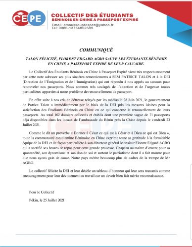 Dans une publication il y a quelques semaines, Le Collectif des Étudiants Béninois en Chine à Passeports Expirés par un communiqué a interpellé le gouvernement du président Talon et les services de délivrance de passeports pour la résolution du problème de non renouvèlement des passeports expirés. Leur appel a semble t-il été entendu. Dans un communiqué signé de leur président, ces étudiants ont à nouveau le sourire aux lèvres parce que la délivrance à eux de ces précieux documents de voyage est de nouveau de mise. «Nous venons très respectueusement vous dire merci pour votre intervention dans le dossier de renouvellement de passeports. Le Collectif des Étudiants Béninois en Chine à Passeports Expirés a eu une réponse favorable du gouvernement et déjà les passeports sont établis par la DEI qui a fait un travail remarquable. Nous passons exactement par les mêmes voies pour adresser nos sincères remerciements à SEM PATRICE TALON et à l’équipe de la DEI et son DG FLORENT EDGARD AGBO pour leur intervention » a fait noter leur président. Ci-joint le communiqué de presse que nous aimerons que vous nous aidiez à publier pour remercier le gouvernement.