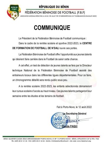 C’est par un communiqué signé du secrétaire général de la fédération béninoise de football Claude Paqui, que l’instance dirigeante du football béninois à sa tête Mathurin De Chacus annonce aux parents et amoureux du cuir rond que pour le compte de la rentrée scolaire 2022-2023 qu’elle procédera aussi à N’dali dans les locaux du nouveau centre d’excellence construit à la rentrée scolaire et sportive. Pour ce faire, un test de sélection pour le recrutement de ces premiers occupants est annoncé dans les jours à venir sous la houlette du directeur technique national et de plusieurs autres entraîneurs.