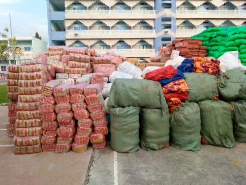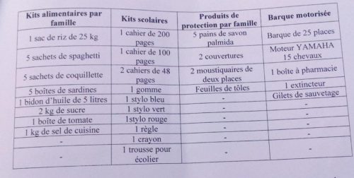 Voici ci contre la composition des kits alimentaires et scolaires, le matériel de protection et les barques motorisées :