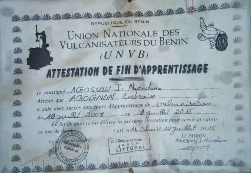 Pas seulement mes frères vulcanisateurs mais tous mes fans. Il n’y a pas de petits métiers. Et il faut croire à son talent, à sa chance. Je n’ai jamais été à l’école mais j’ai cru en moi même et je suis là. Actuellement, comme apprenti vulcanisateur, je n’ai qu’un seul. Mon voeu, c’est d’accueillir des orphelins dans mon atelier et les former. Dieu validera le reste.