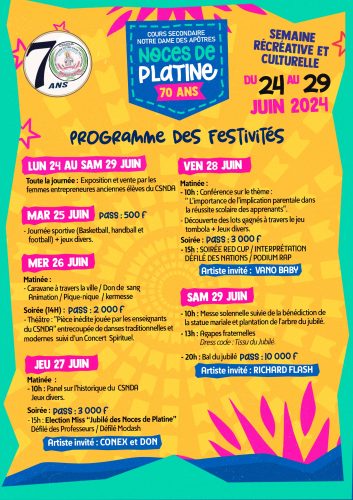 Rappelons que des activités spéciales telles que des visites aux couches défavorisées, des tournois inter-écoles, des dons de sang, des expositions d’art, des sorties de détente ont été organisées tout au long de l’année pour marquer cet anniversaire significatif. Mieux, toute la semaine du 24 au 29 juin 2024, sera l’apothéose avec un menu copieusement concocté. Du théâtre à la danse en passant par le sport, les expositions et concerts, les élèves, enseignants et anciennes élèves du collège vont exprimer et développer leurs talents. Tout ceci sera clôturé par un grand bal animé par Richard FLASH le samedi 29 juin à partir de 19h. Le public est fortement invité à cette grande célébration de 70 années d’excellence.