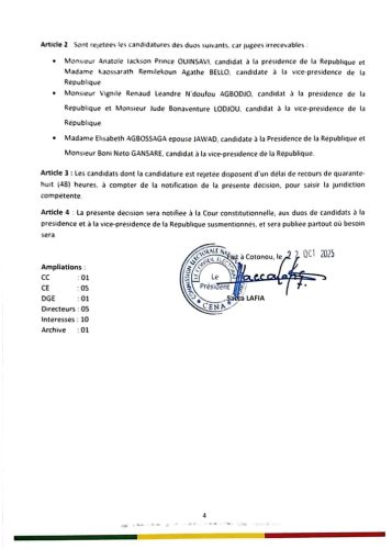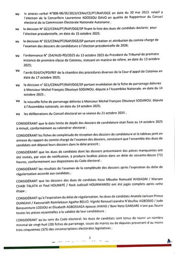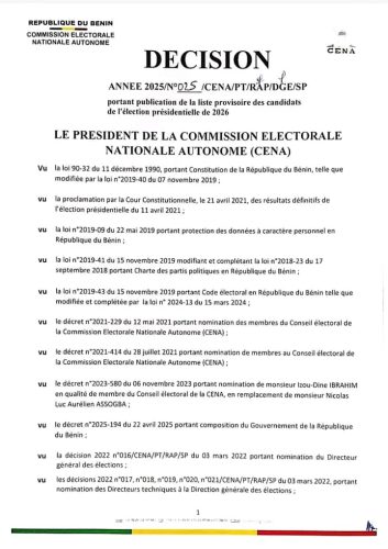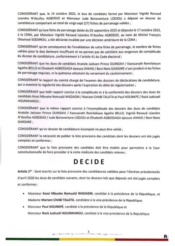 La Commission électorale nationale autonome (CENA) a rendu publique, dans la matinée du mercredi 22 octobre 2025, la liste provisoire des duos de candidats pour l’élection présidentielle d’ avril 2026. Deux duos ont vu leurs dossiers validés, tandis que trois autres ont été rejetés pour dossiers incomplets.