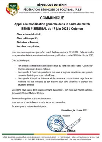 tous, du Nord au Sud, de l’Est à l’Ouest pour pousser à la victoire le Onze National », pouvons-nous lire dans le communiqué du président Mathurin De Chacus. Rappelons que le match Bénin versus Sénégal se tiendra au stade GMK de Cotonou, le samedi 17 Juin 2023 à 20h.