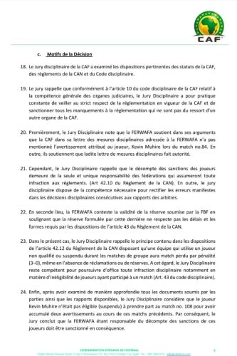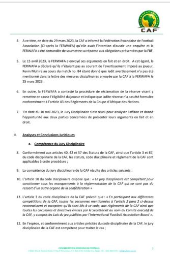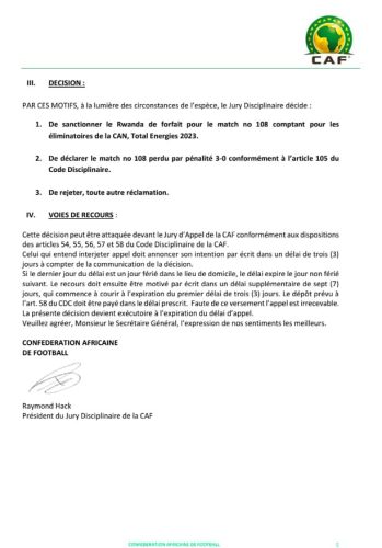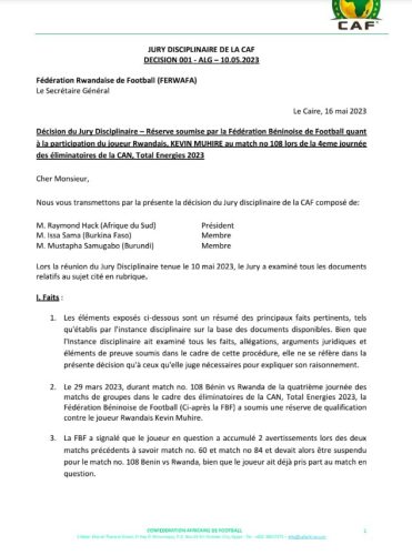 Suite à la requête du Bénin contre la participation du joueur rwandais Kevin Muhire à la rencontre de 4è journée après une accumulation de cartons jaunes lors des deux précédentes rencontres ( Contre la Mozambique et le Bénin en aller), le jury disciplinaire de la CAF a rendu public sa décision ce mardi 16 Mai 2023. C’est au travers d’un courrier adressé à la FERWAFA ( Fédération Rwandaise de Football), que le Jury disciplinaire de la CAF, présidé par le Sud-africain Raymond Hack a donné suite à la réserve soumise par la fédération béninoise de football.