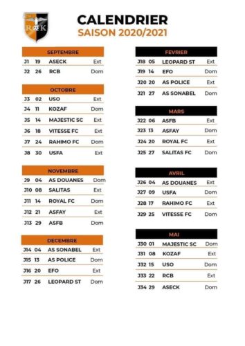 Pour la phase aller, le RCK jouera 6 matchs dans le mois d’octobre dont 4 en déplacement. Les six adversaires le mois prochain sont chronologiquement : USO, KOZAF, Majestic, Vitesse FC, Rahimo et USFA. Pour le mois de Novembre, les Faucons vont en découdre respectivement avec AS Douanes, Salitas, Royal FC, ASFA Yennenga, ASFB.