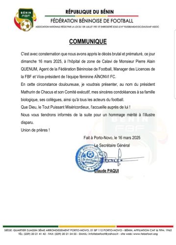 25 mars 2025 Lire l’intégralité du discours du président Mathurin De Chacus Flavien ATCHADE ( F.A) Post navigation Précédent DEUXIÈME TOUR DES ÉLIMINATOIRES DE LA COUPE DU MONDE MAROC 2025 : Victoire historique contre la RDC (3-0)Suivant Gymnasiades U15 – Serbie 2025 : Les jeunes athlètes béninois en pleine préparation Voir aussi Actualités La Une Médias et inclusion financière au Bénin Le RJCIF créé, Adam HOUETENON élu Président 12 décembre 2025 Actualités Sports CAN MAROC 2025 : les 28 Guépards retenus par Rohr ! 12 décembre 2025 Actualités La Une Politique LES MINISTRES DES AFFAIRES ÉTRANGÈRES DU NIGÉRIA ET DU BÉNIN TIENNENT UNE CONFÉRENCE DE PRESSE CONJOINTE SUR LE RÉTABLISSEMENT DE LA GOUVERNANCE DÉMOCRATIQUE AU BÉNIN ET LA SÉCURITÉ RÉGIONALE 12 décembre 2025