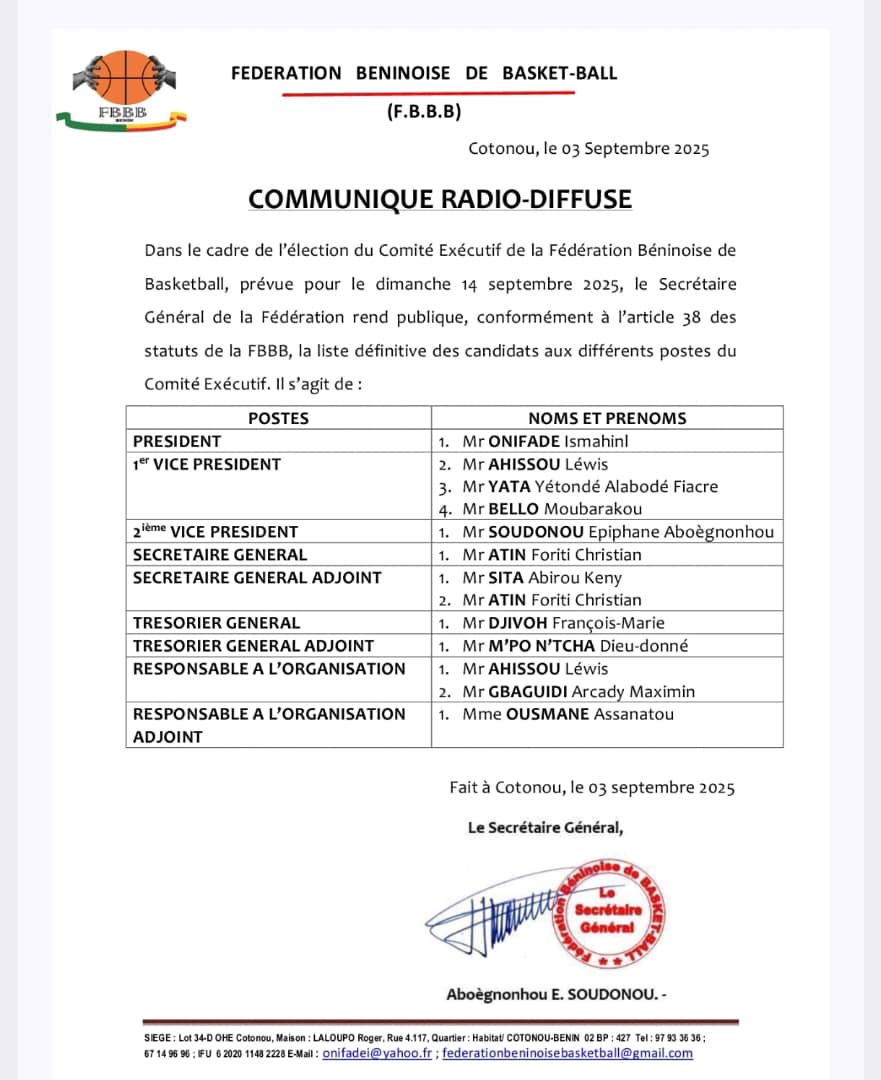 La Fédération Béninoise de Basketball (FBBB) a dévoilé il y à quelques jours,la liste définitive des candidats pour l’élection du Comité exécutif, prévue le dimanche 14 septembre à Porto-Novo, en conformité avec l’article 38 de ses statuts.