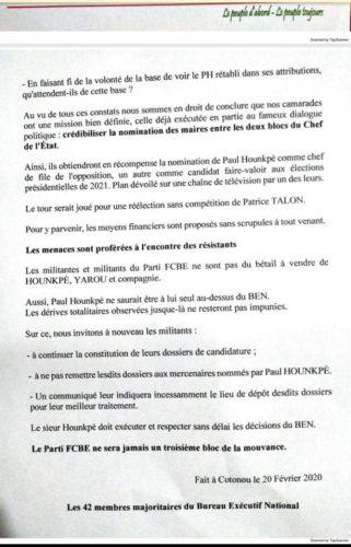 Le Devoir institutionnel qui est le mien est de recommander, conformément à l’exigence majoritaire des militants sur le terrain, privés des documents d’origine, en toute urgence, une session extraordinaire du Bureau Exécutif National aux fins de convoquer avant le scrutin Communal du 17 Mai 2020 un Congrès extraordinaire du Parti FCBE.