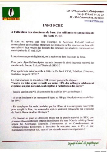 Le Devoir institutionnel qui est le mien est de recommander, conformément à l’exigence majoritaire des militants sur le terrain, privés des documents d’origine, en toute urgence, une session extraordinaire du Bureau Exécutif National aux fins de convoquer avant le scrutin Communal du 17 Mai 2020 un Congrès extraordinaire du Parti FCBE.